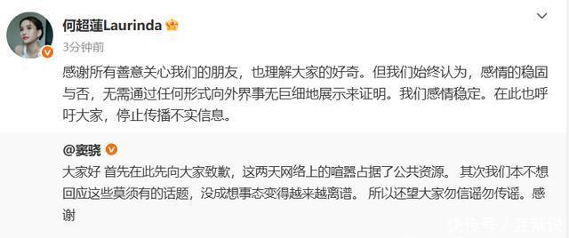 10月23日晚19:41,近日因向太发布的视频引发婚变传闻的窦骁、何超莲夫妇发布声明。 窦骁发文表示: 大家好,首先在此先向大家致歉,这两天网络上的喧嚣占据了公共资源。其次我们本不想回应这些莫须有的话题,没成想事态变得越来越离谱。所以还望大家勿信谣勿传谣。